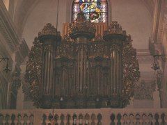 Drugie piętro krużganków też posiada prostokątny obrys. O galerii karmelitańskich dostojników, choć parę słów – obok. Tu znalazło się miejsce (w kącie) dla barokowego ołtarza św. Eliasza z połowy XVIII w. Retabulum (nastawę ołtarzową) rzeźbił brat Grzegorz Kaczyrek, a obraz malował Józef Kopaczyński. Jest również grupa Ukrzyżowania, późnobarokowa, postawiona na mensie. Obok krzyża ustawiono rzeźbę zapłakanej Marii Magdaleny. W innym skrzydle urządzono oddzielną niszę dla Najświętszej Maryi Panny. Kolejna rzeźba w drewnie, z epoki dojrzałego baroku, to już portal wejściowy na chór kościelny. Ponad wejściem przyczółek tzw. przerwany – odwrócony. Na jego półokrągłych „uszach” siedzą dwaj aniołowie : czerwony i granatowy. Jeszcze dostrzec można promienistą glorię z kręgiem uśmiechniętych główek, amorków. Jest to zwieńczenie jednego ze zlikwidowanych ołtarzy bocznych kościoła. Niepowtarzalne w wyrazie i rzadko spotykane w typie, są dwa obrazy wotywne z końca XVI w., namalowane na blasze miedzianej. Na jednym postrzegamy Chrystusa w rozmowie z Samarytanką przy studni., a w opisie czytamy :”Barbara Szotyńska o Modlitwę pokornie prosi”. Podobnie o westchnienie modlitewne zabiega Elżbieta Kłosińska, z tym, że ta wybrała za patronkę św. Marię Magdalenę. Przy oknie wypełnionym witrażem stoi zegar roboty Marcina Taborskiego (z 1763 r.). Posiada ładnie malowaną tarczę, w kwiaty i owoce.